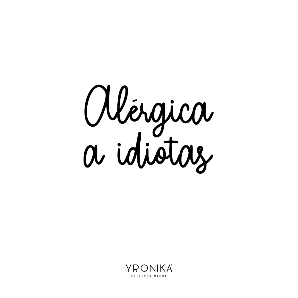 Texto preto manuscrito 'Alérgica a idiotas' sobre fundo branco com marca YRONIKA FEELINGS STORE abaixo