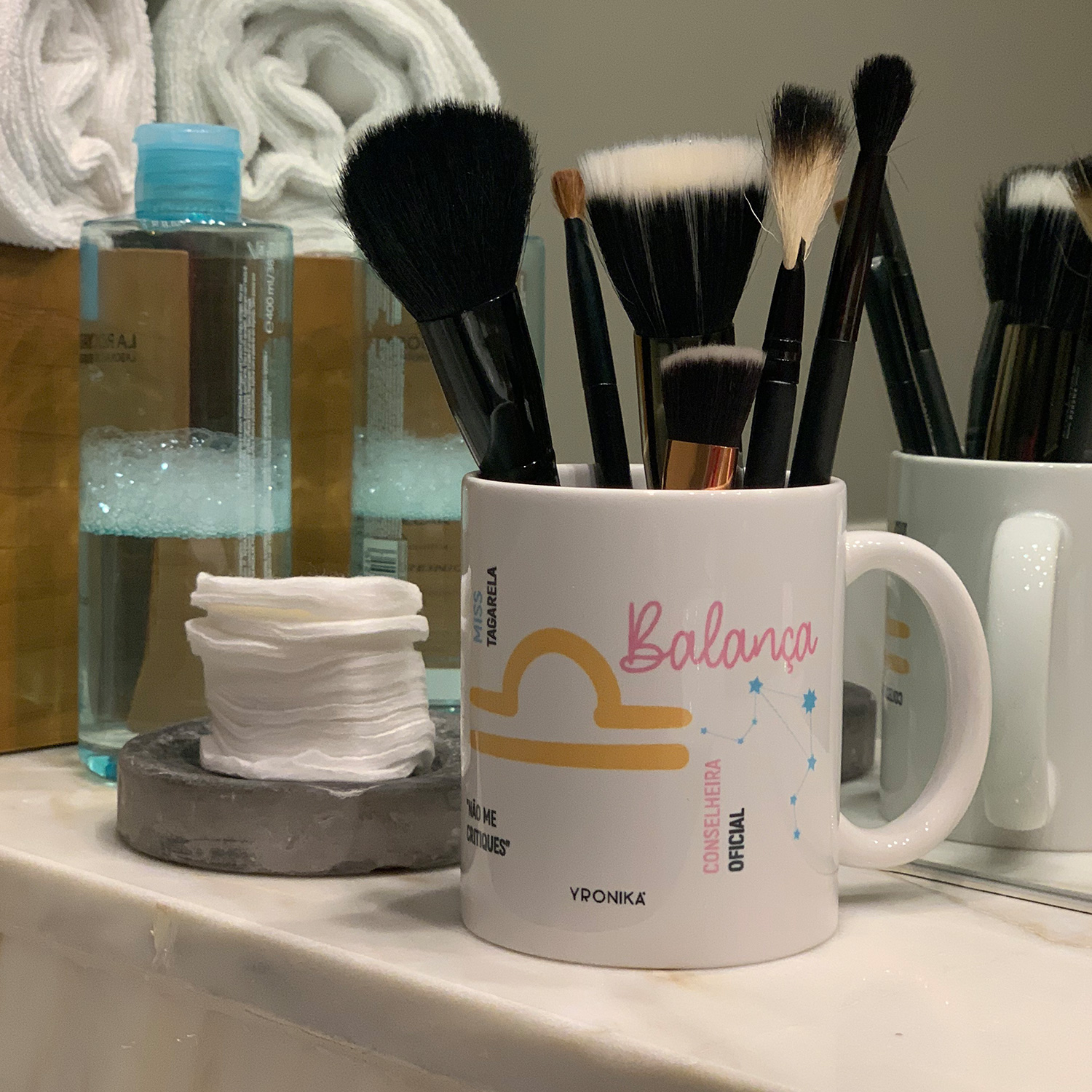 Caneca com pincéis de maquilhagem numa bancada de casa de banho com discos de algodão, garrafa de líquido e toalhas