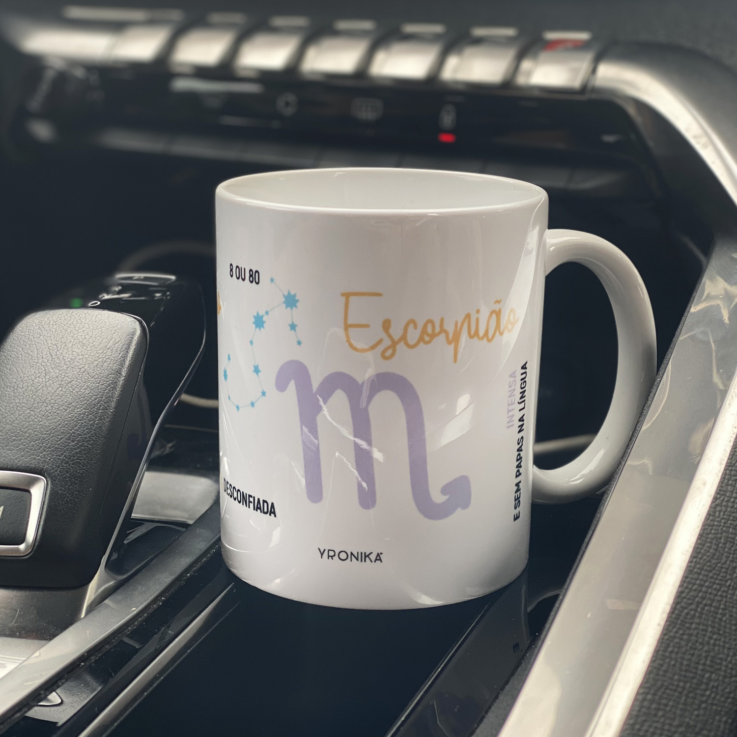 Caneca branca com alça e design decorativo, na consola central de carro